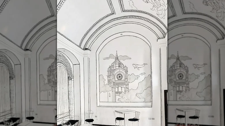 Целосно црно-бело илустриран ентериер што изгледа како да сте влегле во скица. Секој детал – од мебелот до архитектонските линии – е „нацртан“ со рачно изгледани контури.
